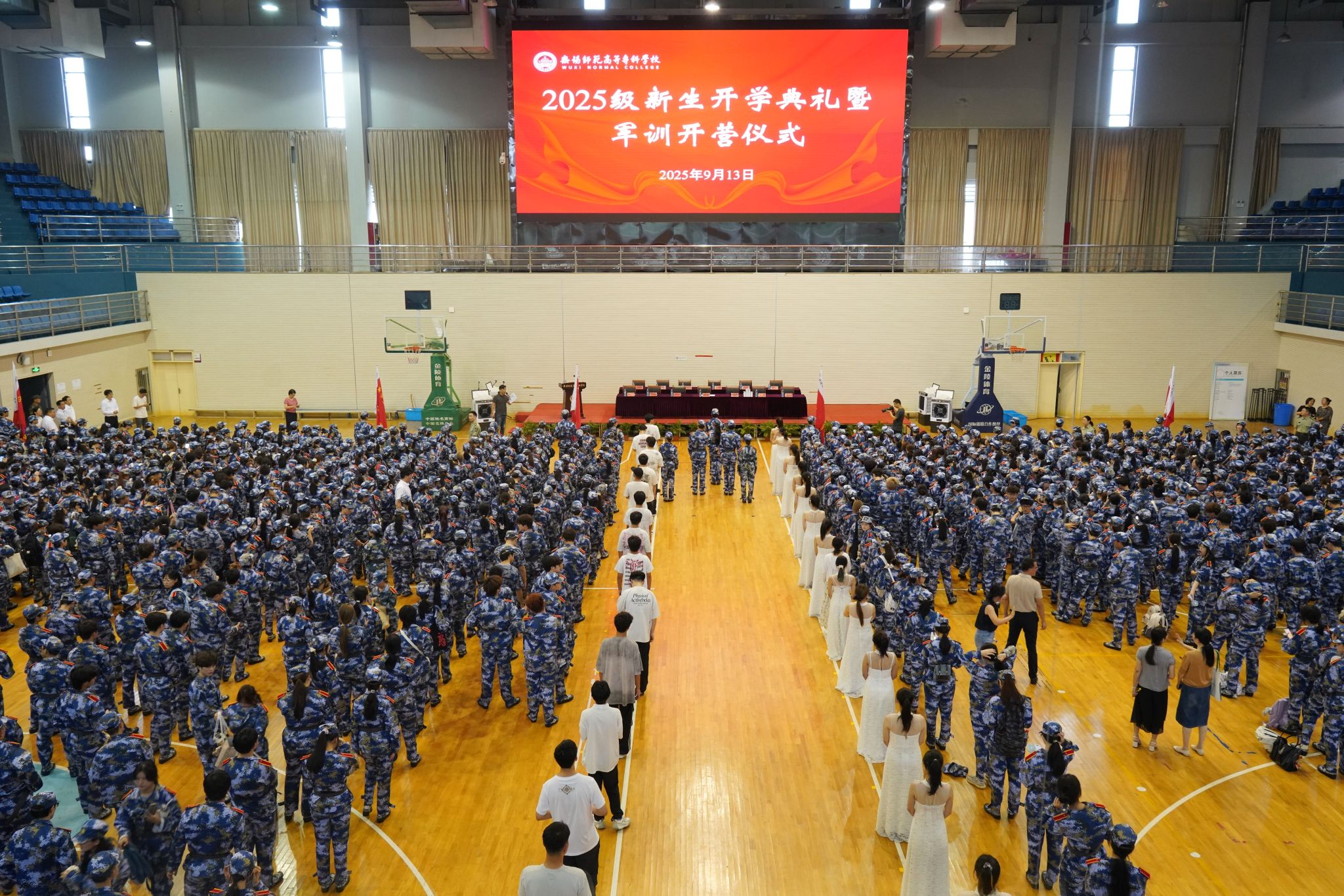 9月13日上午9时,无锡师范高等专科学校2025级新生开学典礼暨军训动员大会在体育馆隆重举行。校党委书记陈琳,副校长赵刘、邵小明、过健,党委委员、宣传部部长费云霞,承训部队教官代表,各二级学院及相关部门负责人出席大会。大会由副校长过健主持。大会在庄严的国歌声中拉开帷幕。