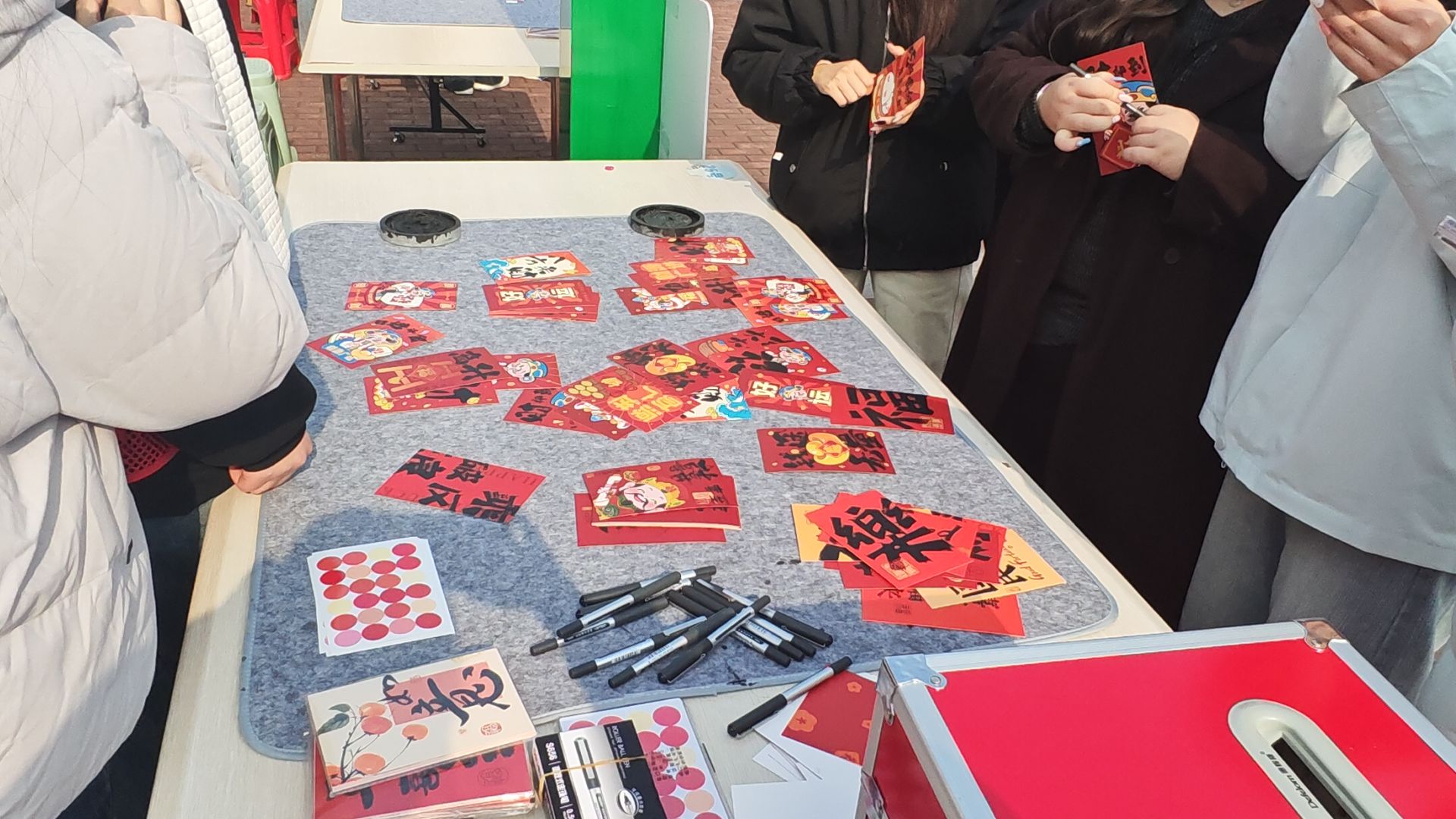 广场中央,书法长桌依次排开,师生们凝神执笔,挥毫落纸。笔锋流转间,或苍劲雄浑,或清秀工稳的“福”字与春联跃然纸上,翰墨芬芳中寄托着对新春最美好的祈愿。一旁的福字拓印体验区吸引众人驻足,同学们或屏息凝神,或指尖轻点,传统技艺在指尖流转,寓意吉祥的纹样被细心拓印成幅,彰显非遗魅力。